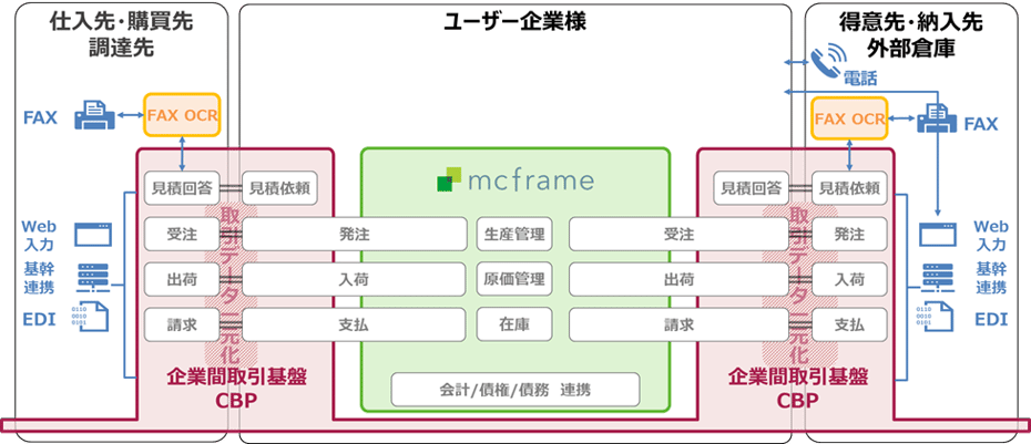 mcframeと連携することで、取引先を巻き込んだ購買・販売業務プロセスの標準化を実現し、取引データの利活用を促進し、サプライチェーン・業界全体のDXを推進します。