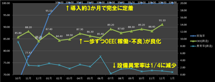 実際の、作業実施率/OEE(総合設備効率)/設備異常率の推移がこちらになります。