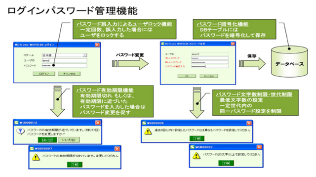アプリケーション管理機能の中で、どのような業務アプリケーションにも必ず必要になる機能がユーザ管理と権限管理です。ユーザ管理・権限管理は言い換えれば認証管理・アクセス制御管理であり、正規のユーザがシステムにログインすること(不正ユーザがログインしないこと)の管理(≒認証管理)と、ユーザが許可された画面を開き、ボタン処理を実行すること(画面の不正利用、不正実行がされないこと)の管理(≒アクセス制御管理)と言えます。不正ユーザにログインさせず正規ユーザだけが正しくログインするためにはパスワードの管理が重要になりますが、XA FrameManager Platformでは図にあるような各種のパスワードに関する管理機能を提供しています。